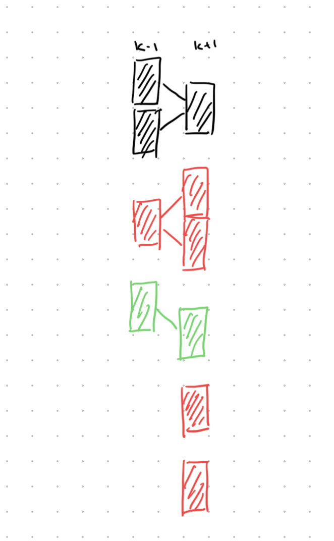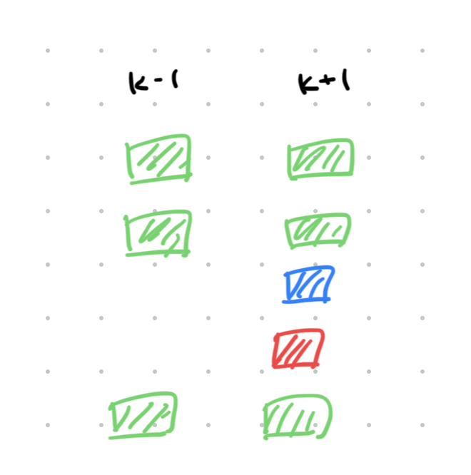 Our claim is that there exists two optimal solutions for and such that all components are either green (equal # of tiles on left and right) or red (one more tile on right). Assuming this is true, there will be exactly two red components, and we can toggle the one with larger net gain to achieve .