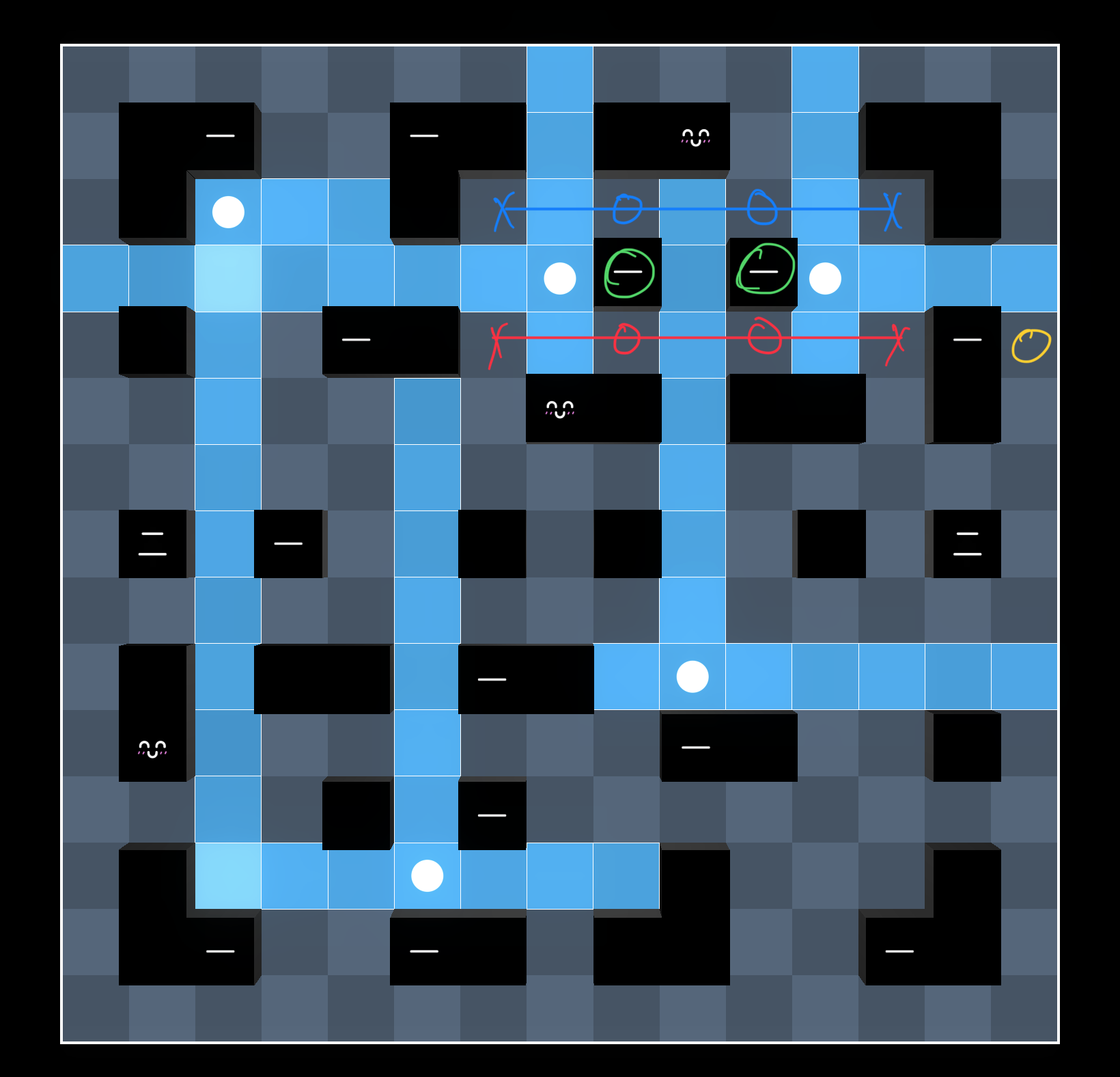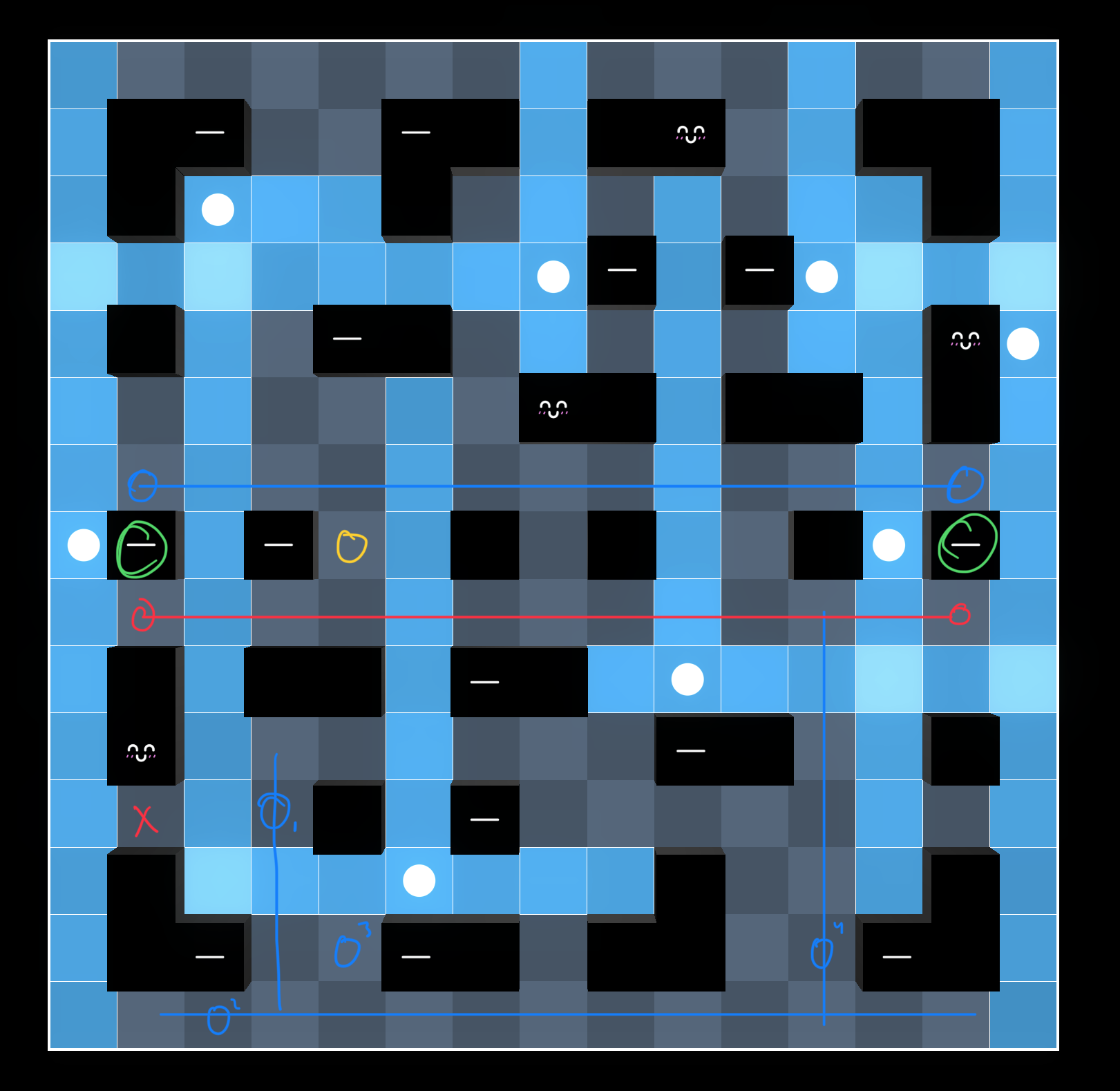 now in the bottom half of the puzzle, we can place a series of lights after rescuing the red X. in the top half, the two green 1s eliminate most cells on the red and blue lines, and in particular this means the yellow light must be placed: