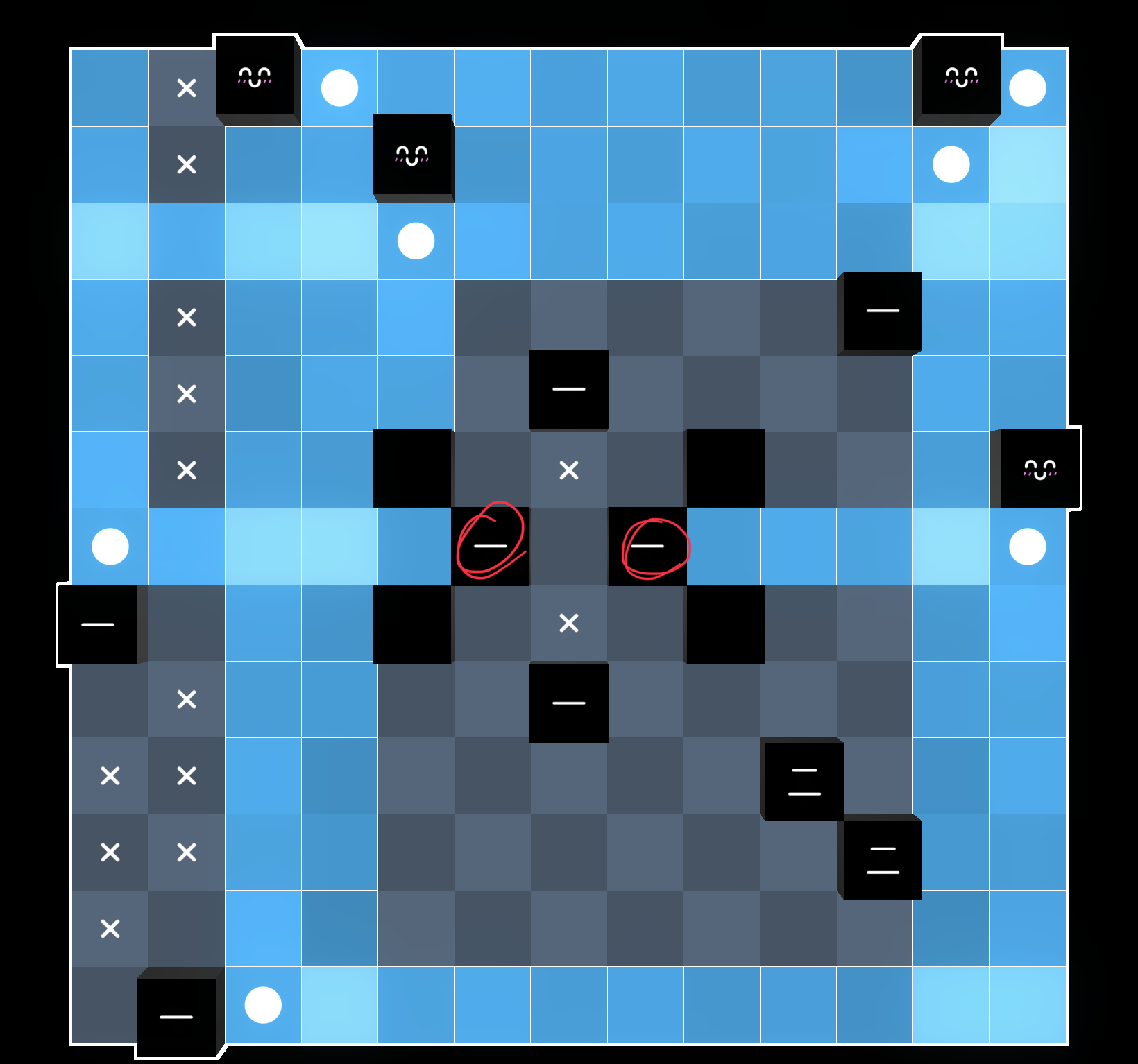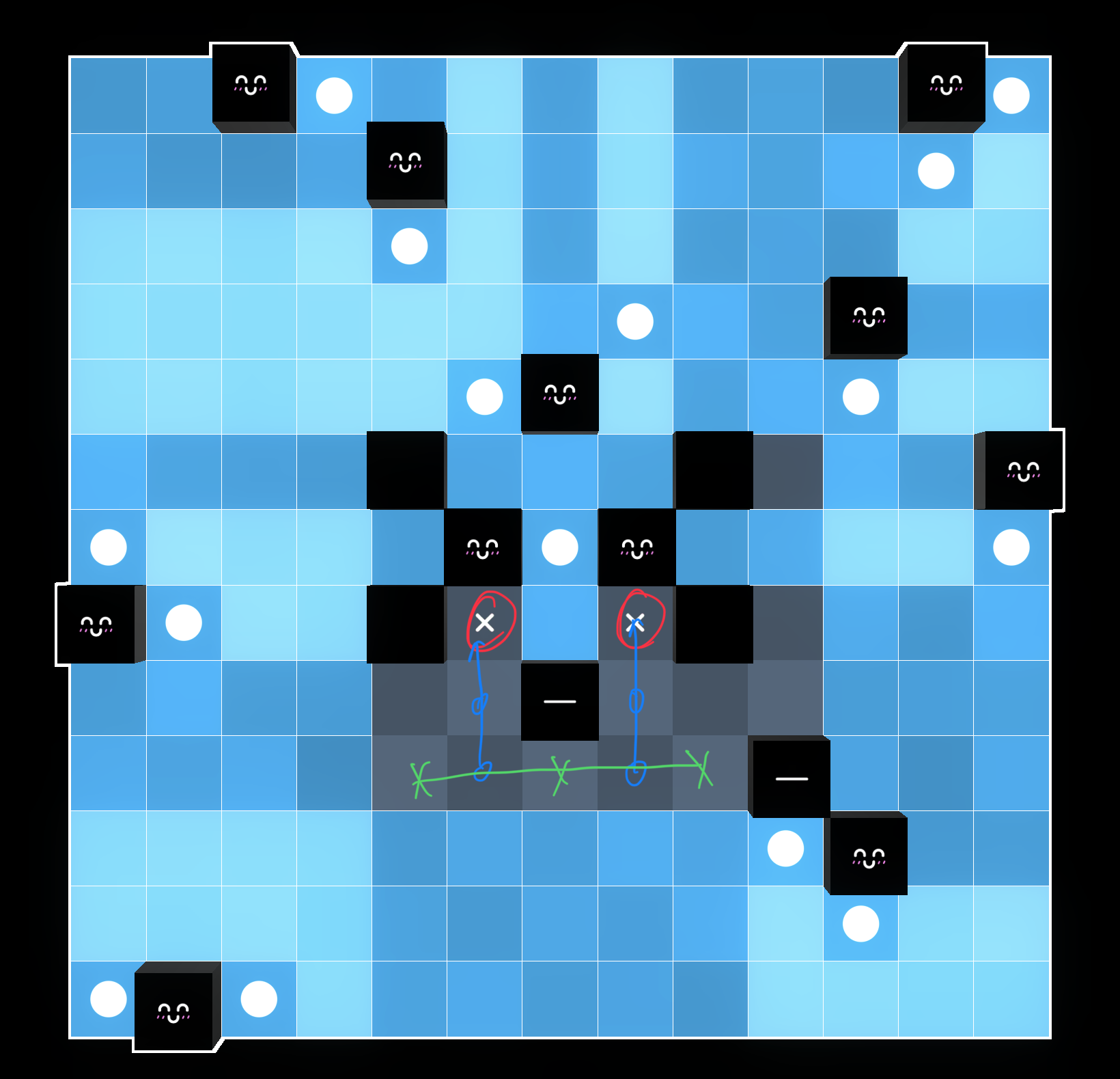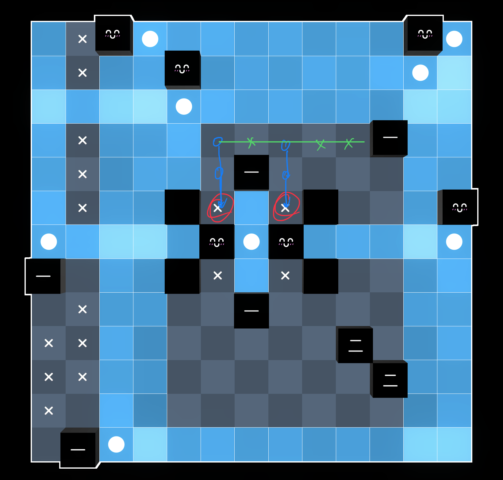 we can place these two x’s, as otherwise the two red 1s would be forced onto the same line: