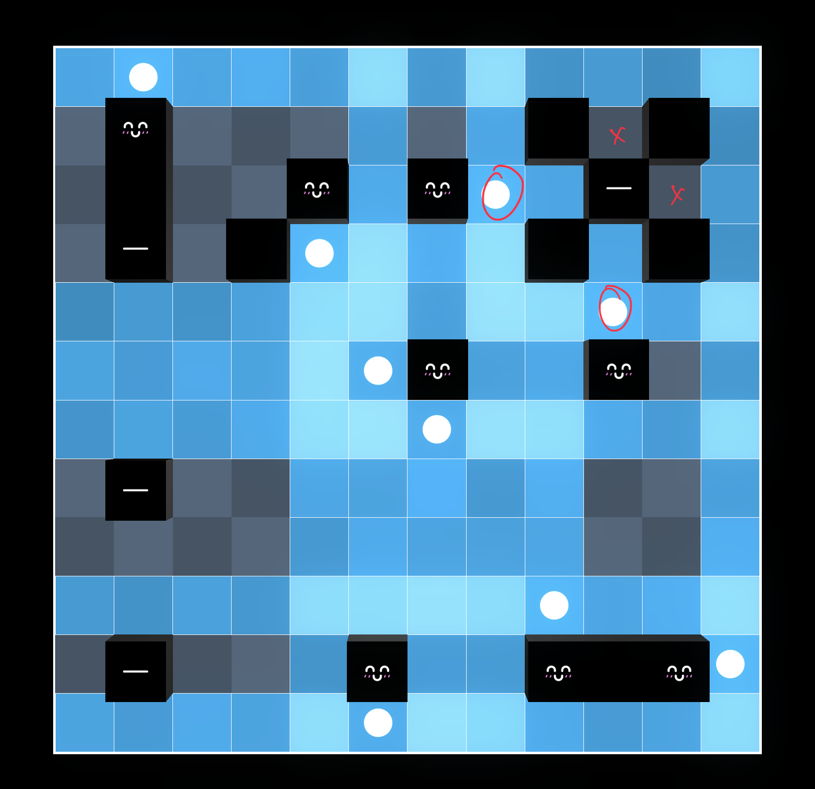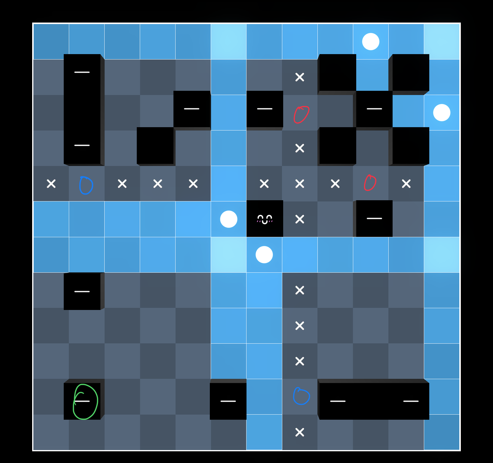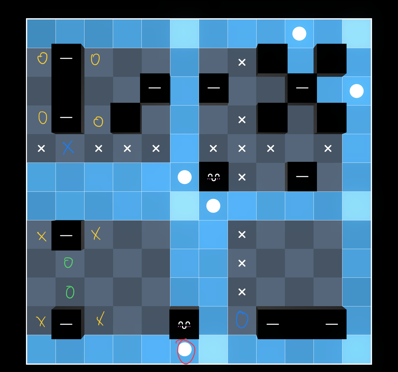 otherwise the blue square and X are forced, and by line-counting the yellow squares are eliminated and thus the green squares are forced…but these conflict with each other, so it’s impossible.