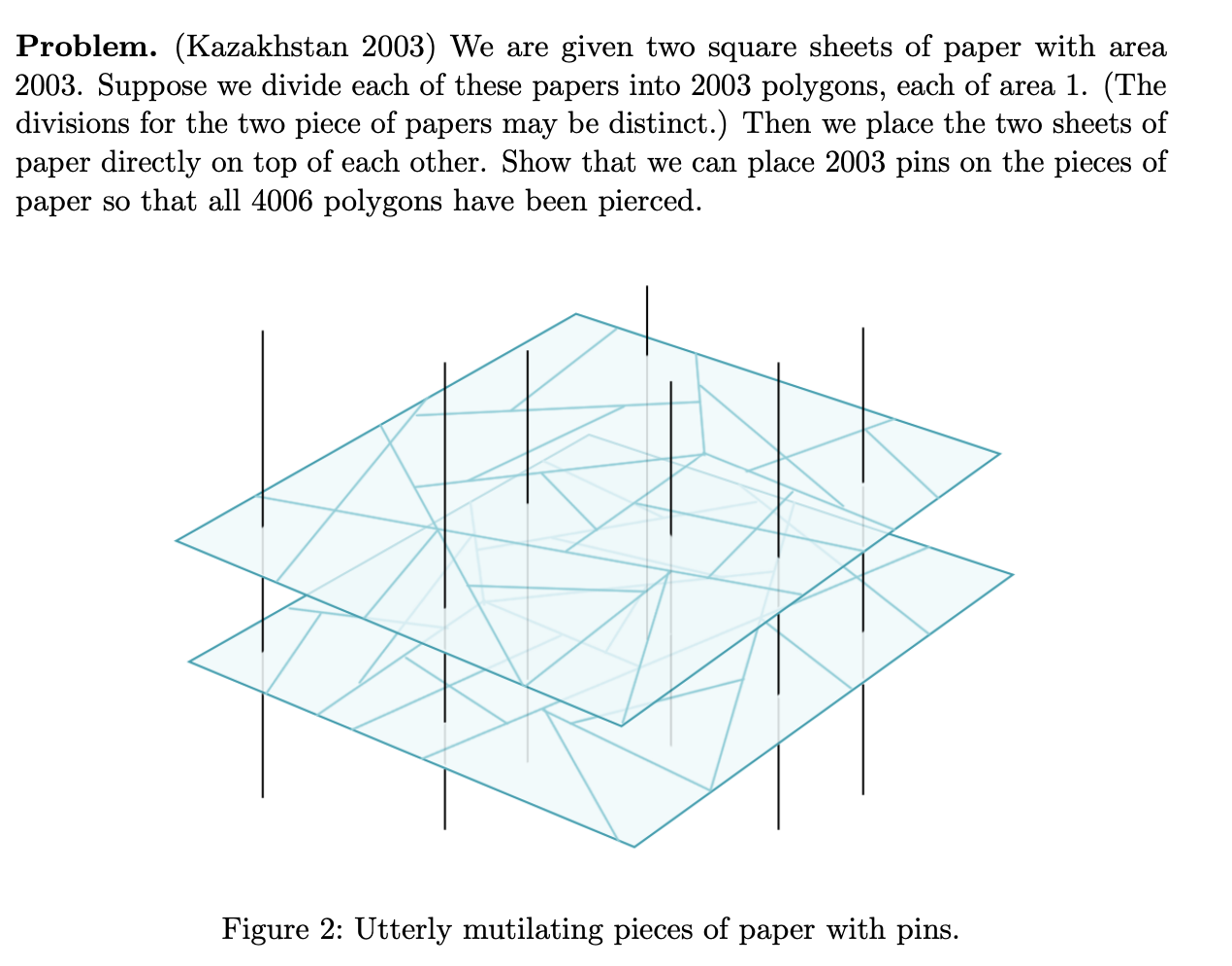 Construct the graph in which each of the 4006 polygons is a vertex, and an edge is drawn between two vertices if their corresponding polygons can be pierced by a single pin. Now we just need to show that for every set of polygons , . Since all polygons have area 1, and are precisely the areas of and respectively, so our desired inequality easily follows since the area defined by must strictly contain .