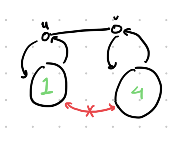 If only type 1 and type 4 nodes exist, the graph looks something like this. The red edge cannot exist in either direction because then a type 2/3 node would exist, which contradicts our assumption.