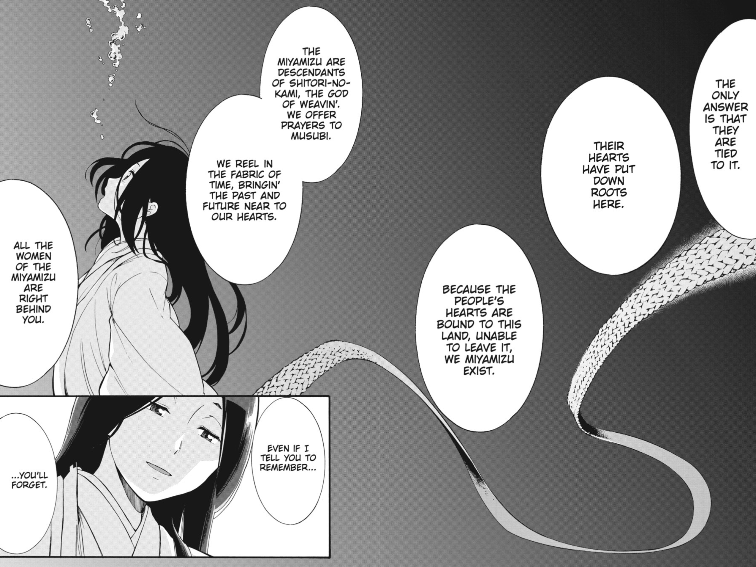 Through their weaving tradition, the Miyamizu are able to temporarily manipulate the threads of time and connect to the past or future. And, like dreams, even when these temporary deviations are reconnected to the main thread---memories erased, notes deleted---they still inevitably change its overall shape.