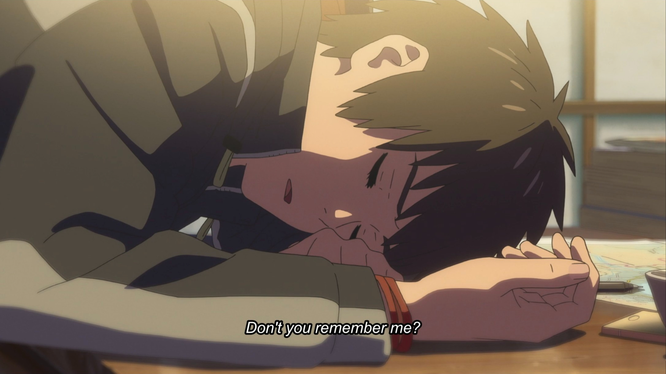 However, it also wouldn’t have helped much if Taki had actually written his name. We see later that even when Taki hears Tessie’s name, he feels a vague sense of familiarity but still doesn’t remember anything about him. Even when Taki recognizes Mitsuha’s red cord and runs out into the subway station, he doesn’t search any further because he still thinks his feelings are irrational. In the end, the only reason the two get to meet again is because of the look they shared of mutual recognition, confirming that their respective feelings weren’t just one-sided delusions.